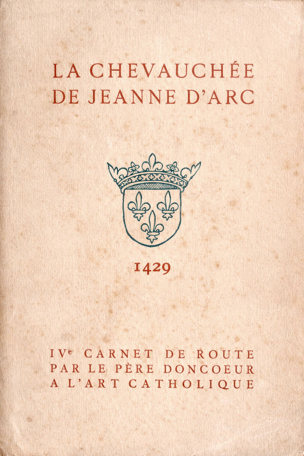 La chevauchée de Jeanne d’Arc — 1429 — IVe carnet de route par le père Doncœur à l’Art catholique [Dernière page] Achevé d’imprimer le 21 janvier 1429 en la fête de Ste Agnès, martyre, sur les presses de l’Art catholique, 6, place St-Sulpice à Paris