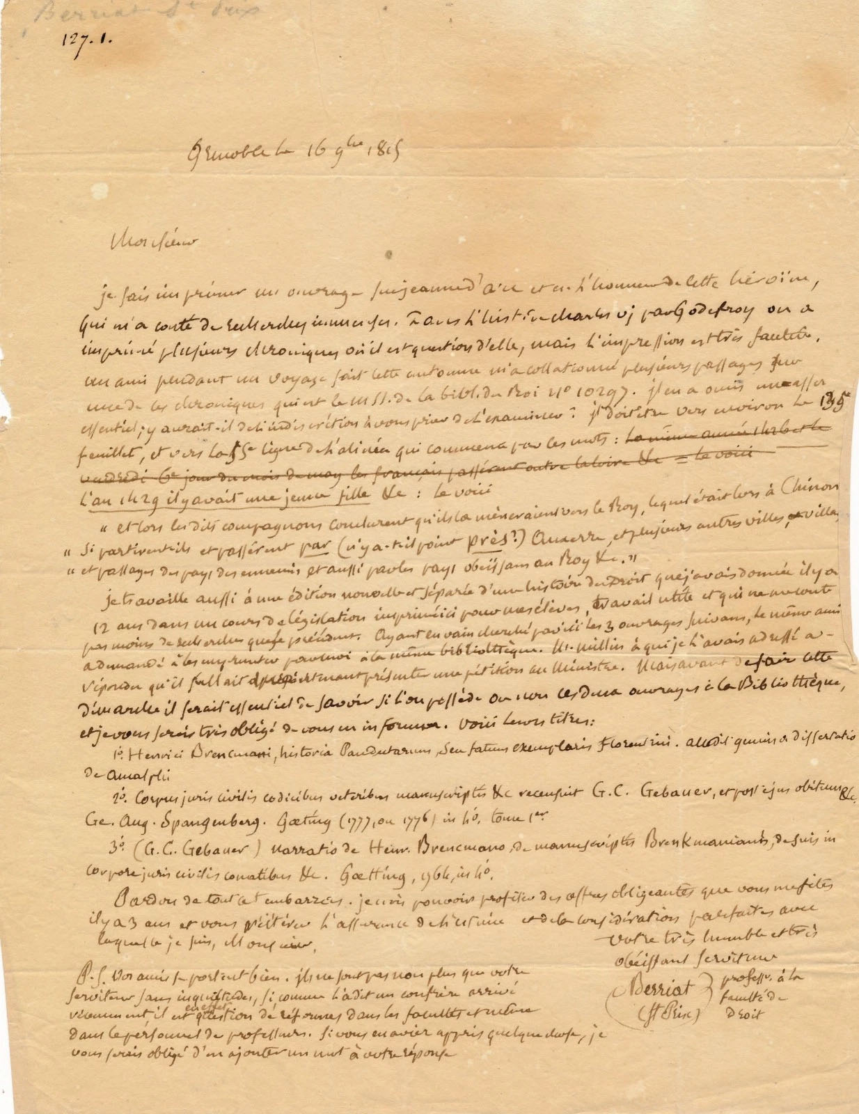 Pardon de tout cet embarras. Je crois pouvoir profiter des offres obligeantes que vous me fîtes il y a 3 ans et vous réitère l’assurance de l’estime et de la considération parfaites avec laquelle je suis, Monsieur, Votre très humble et très obéissant serviteur Berriat St Prix, professr à la faculté de Droit.
